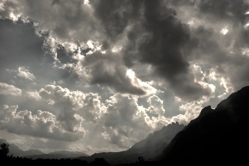Where I come from, the sky is a vast stage for clouds devising mad plays with light. It’s a theatre for giants, the steep rocks of the mountains lining the valley. Imitating the frills and laces of the ladies’ dresses. You can tell the weather by its holes, by the way.