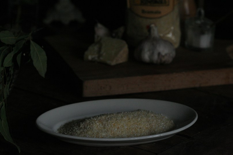 I went to France for the unkempt landscapes of my past. To rediscover the particular mood of cultivated land seemingly untouched by the iron grip of optimisation and efficiency. I sought simplicity and quiet. And stumbled across Ribel in my new home. In a casual chat with the former village teacher. Gaudes, they call the ground maize in their local French patois. Or blé Turc, Turkish corn. It’s said to be had only in the Franche-Comté. Cooked for hours on end with milk and water, in an immense cauldron over the fire. A silky thread linking my origin to my chosen place of home. Defying me to pay it attention, transforming it into a (decent) dish, bearing in mind my grandmother’s somewhat accurate verdict. A dish that flatters the palate instead of making you choke on a seeming handful of sand. I relied on the well established risotto principle, using the bramata version of Ribel, which is of a bigger grain, less sandy. It worked out remarkably well, even earning me a surprised nod by my mother.