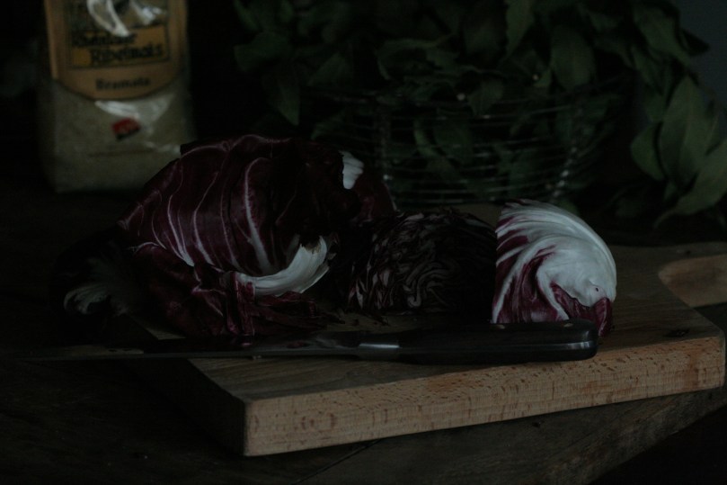 Pour a generous puddle of sunflower seed oil into a large, wide pan, add 1-2 cloves of garlic and a laurel leave. Heat up slowly, you would not want to burn either of the ingredients. Pour a good handful of grossly ground maize per person and glaze gently for a couple of minutes and then add a sip off white wine. Enjoy the hiss and the steam. Throw in a piece of (very) old cheese rind if available, it will add flavour and savour. Cook and stir, clockwise, adding an occasional scoop of vegetable stock (homemade, I say you owe this to yourself), keeping the grains covered and nonchalantly simmering. It is the risotto principle, meaning that this isn’t a dish that tolerates negligence (or showing off your fabulous multitasking skills). It calls for your steady attention. Meditation in the steaming copper pan will do just perfectly. Thing with the Ribel bramata is that theoretically you can cook it forever, it won’t go over the point of being al dente. I find this very practical when we are having guests. Generally, it’s done after about 30 mins of cooking.