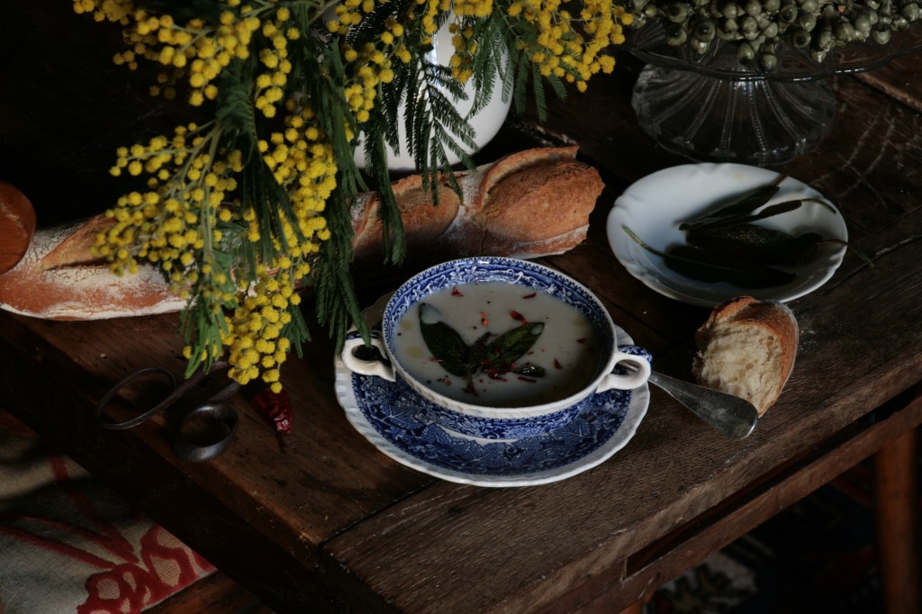 The snow falling silently outside the window of my  kitchen brings me back into mid January, and I crave for food that warms the heart and feeds the soul. A Mogette Soup is just the perfect thing to answer this call. I spiced it with chilli and added fried sage leaves, and it was very delicious. And this is how it goes: