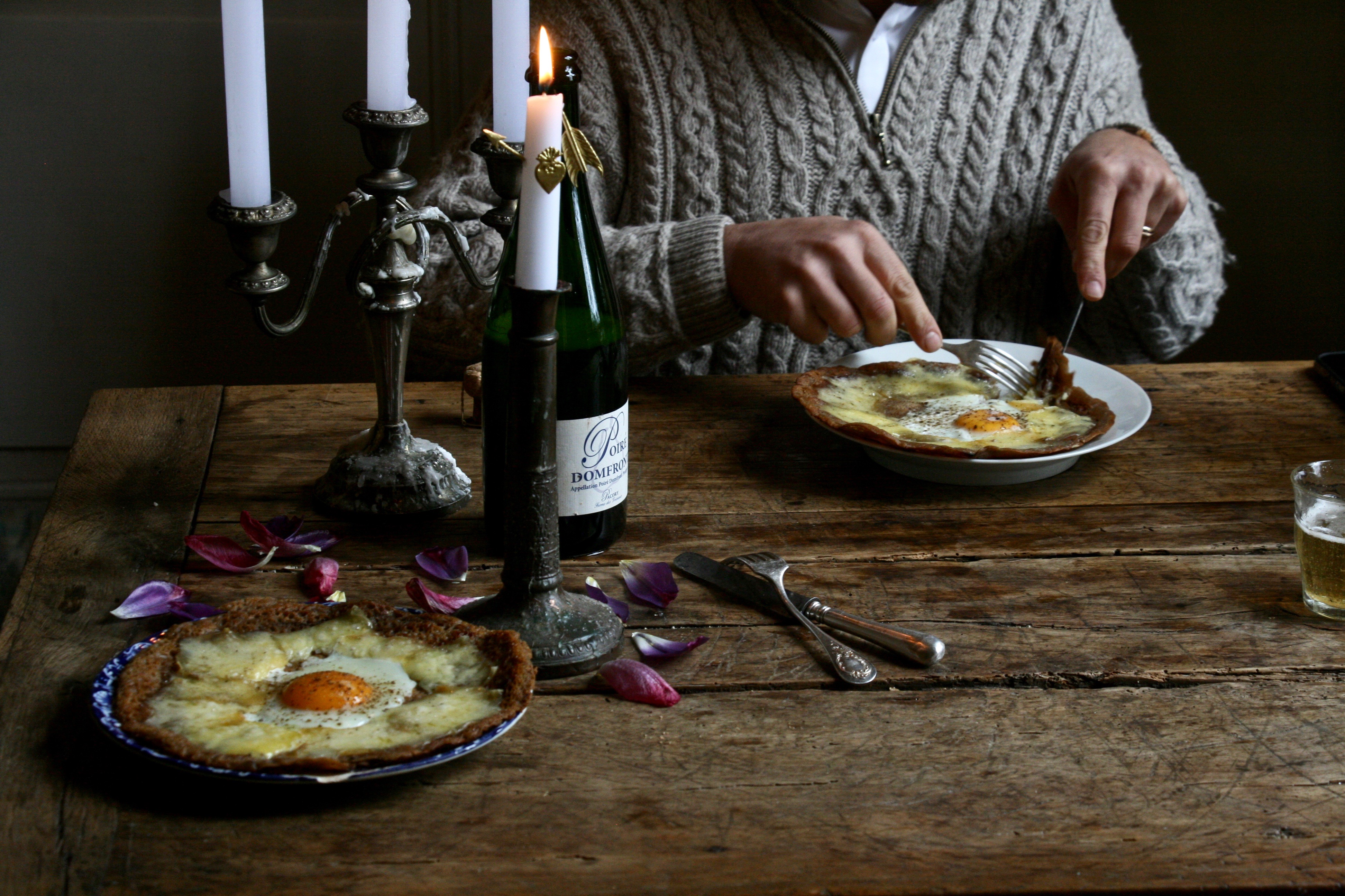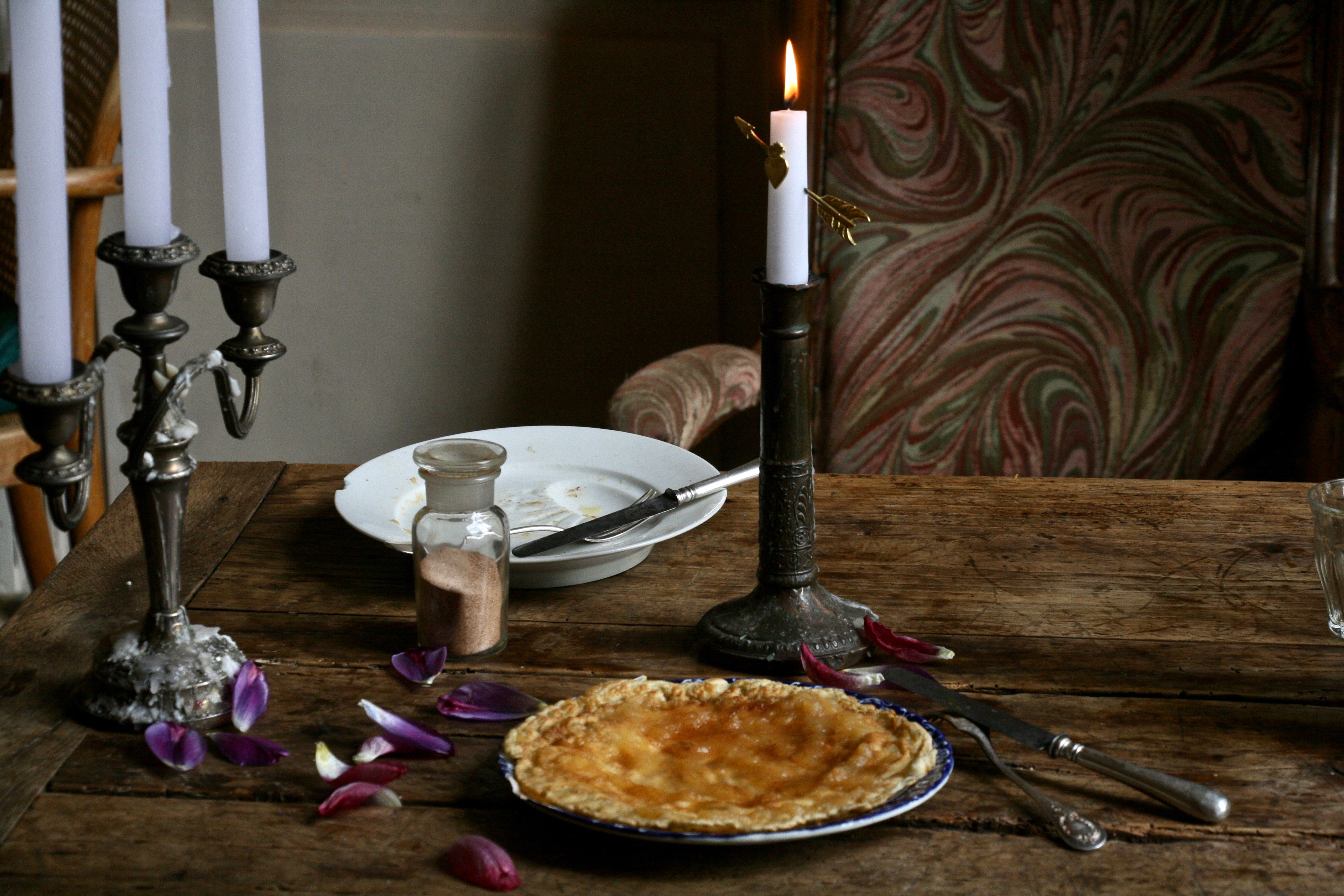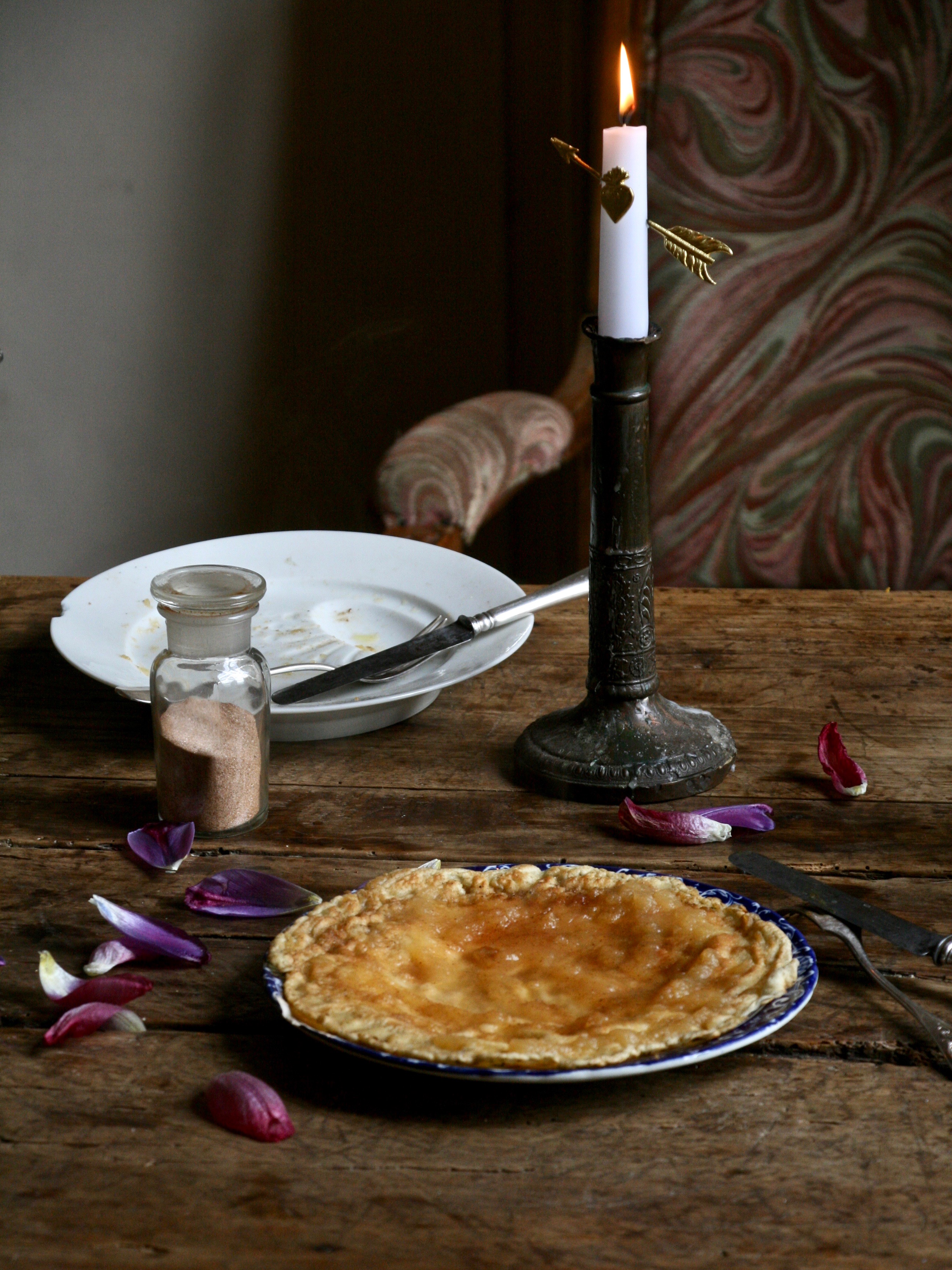 Around this time of the year, where I come from, we used to make bonfires to chase the winter away, in some areas they cut a trunk into rounds, lighted those and made a contest of who could throw the brightest and highest, old pagan rite cheering the sun into returning. In French tradition, who would have thought, people throw crèpes. It looks very familiar to me this rite yet I can’t suppress a smile at their making it into a culinary thing. The crèpes of course, are not just thrown, but eaten after all, loads of them in fact, in order for house and home to prosper. If one really wishes to make sure, one must throw a crèpe on the kitchen dresser where it shall sit all year round. I haven’t done the latter yet, I admit, also for the time being I don’t even have a proper kitchen dresser as everything here is makeshift and temporary with the ongoing restorations. But of course I made crèpes on Chandeleur. Mine are always a bit thick, curtsey of my heritage, but I really like them better when they’re a little more substantial. One batch was conté and morbier cheese and an egg on top, the other batch apple compote with cinnamon and a dash of calvados, like a generous dash really. I also lit a lot of candles, but that’s something I do anyway when the days are sombre. I’m probably a little late to the party with posting the recipe only now, but then I guess Chandeleur is something we may celebrate all month of February until carnival at any rate. Also there’s no limits as to toppings and combos, and I’d be thrilled to read your very own favourites and/or your February traditions in the comments section!