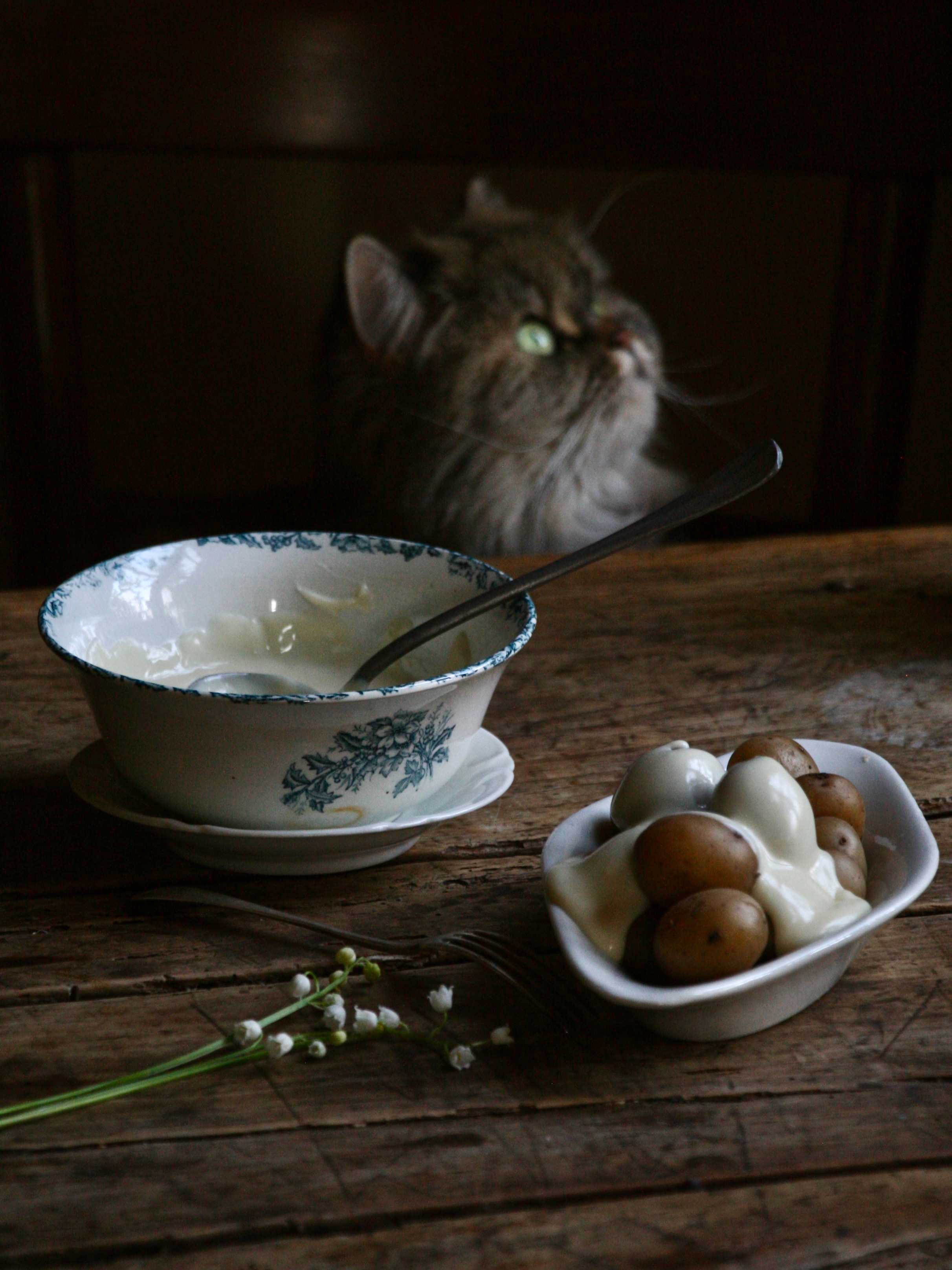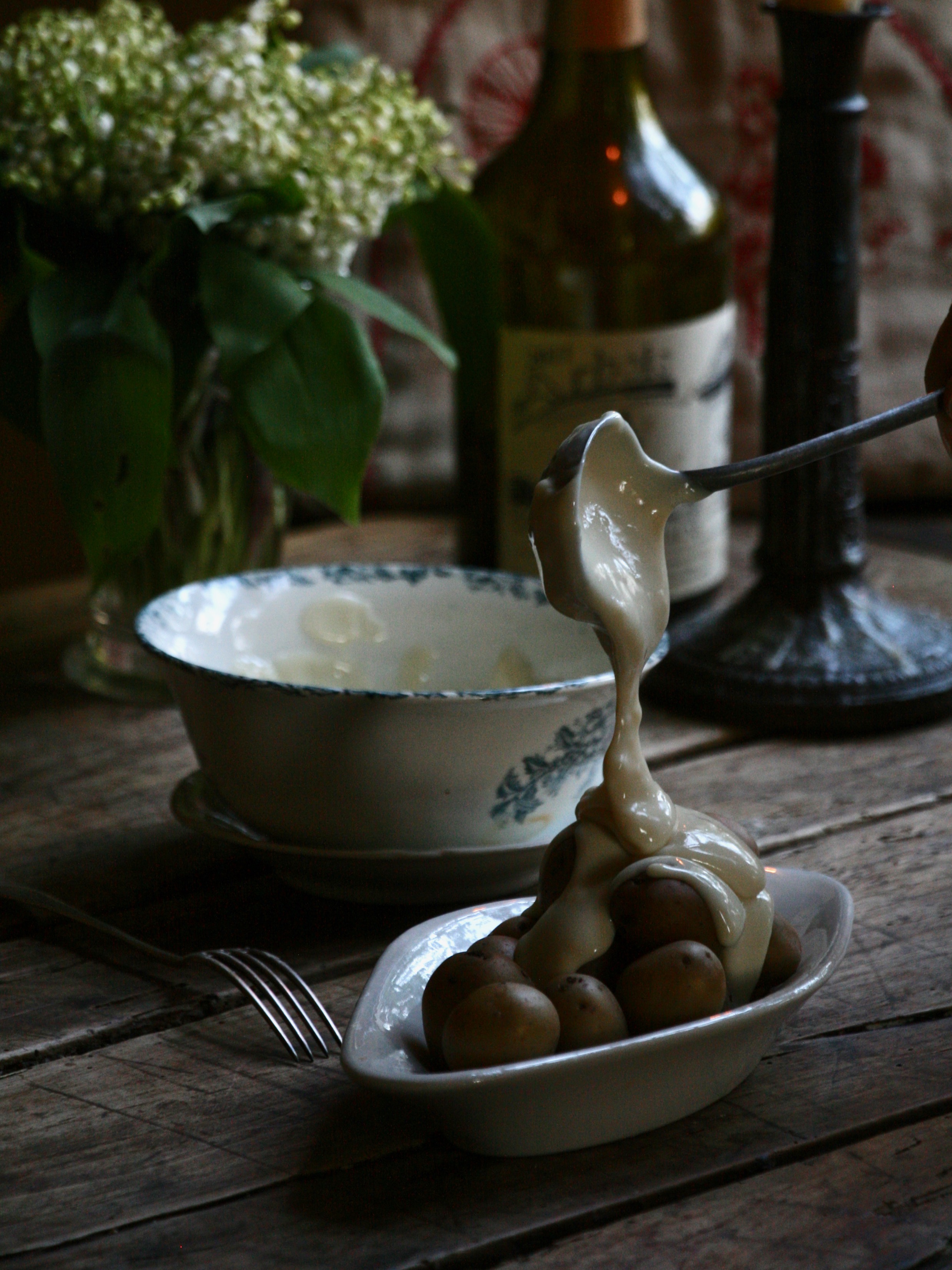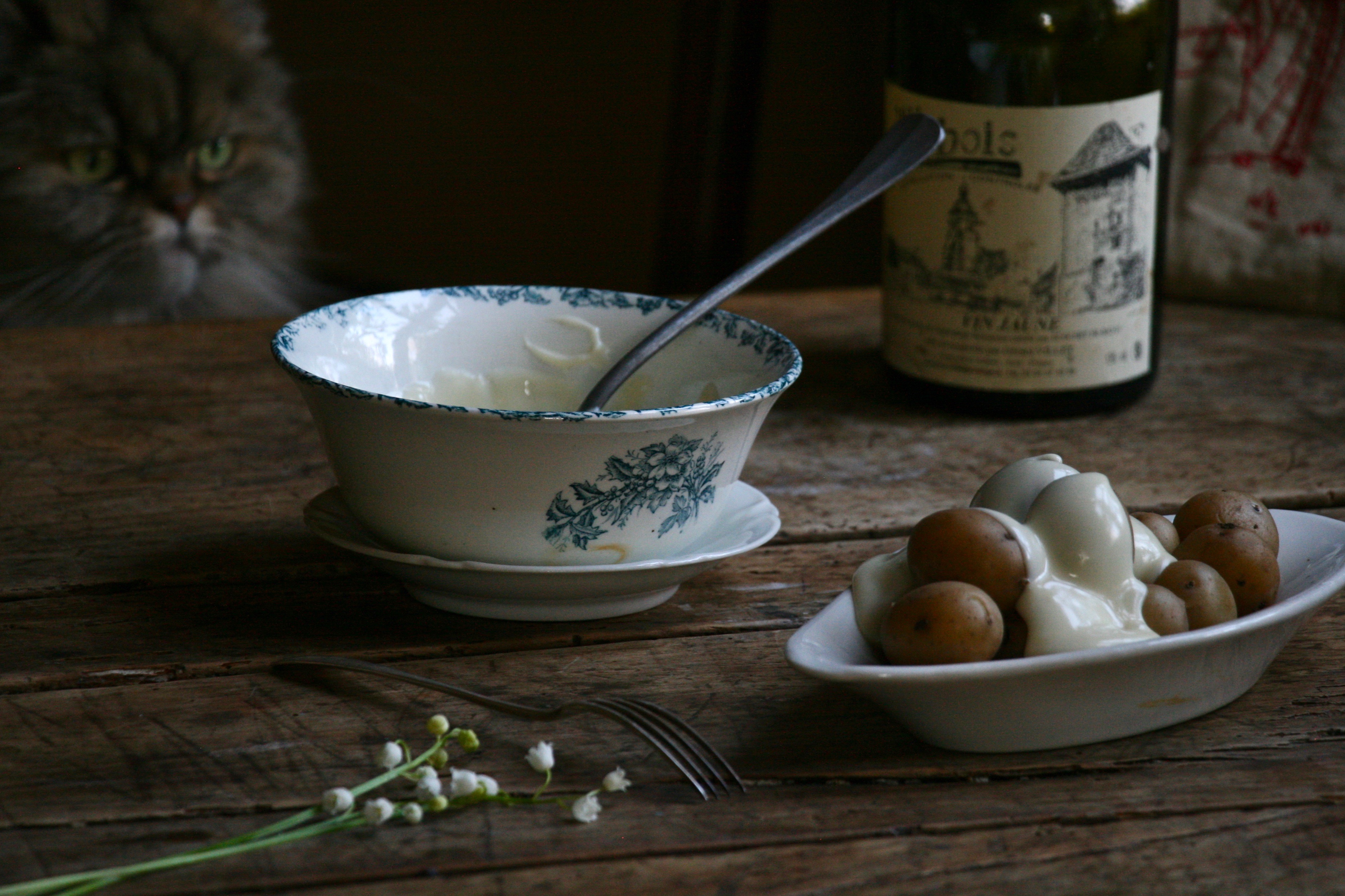 I like to crush my potatoes so to get the maximum concoillotte per potato, but you may as well cut them or eat them whole. As to wine, this is sturdy lands, an aged chardonnay will do well, or Vin Jaune. Also enjoy it a lot and I even heard that cancoillote is very very very healthy, so it’s really self care on every level, don’t you think?