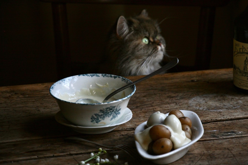 This is a typical farmer’s dish, agriculture culture where nothing goes to waste. You’ll take the milk and skim off the cream to make butter from and crème fraiche, and you’re left with a lot of skimmed milk, probably more you can drink and make bread of and it will turn, and so you’ll make curd and let it dry so it keeps. And when you’re feeling like you could do with a pot of cancoillote you’ll take a cup of curd and melt it and you may add a little garlic and maybe a sip of Vin Jaune and there you go. It’s probably the unfanciest of all French dishes I admit. Yet what I call the queen of comfort food!