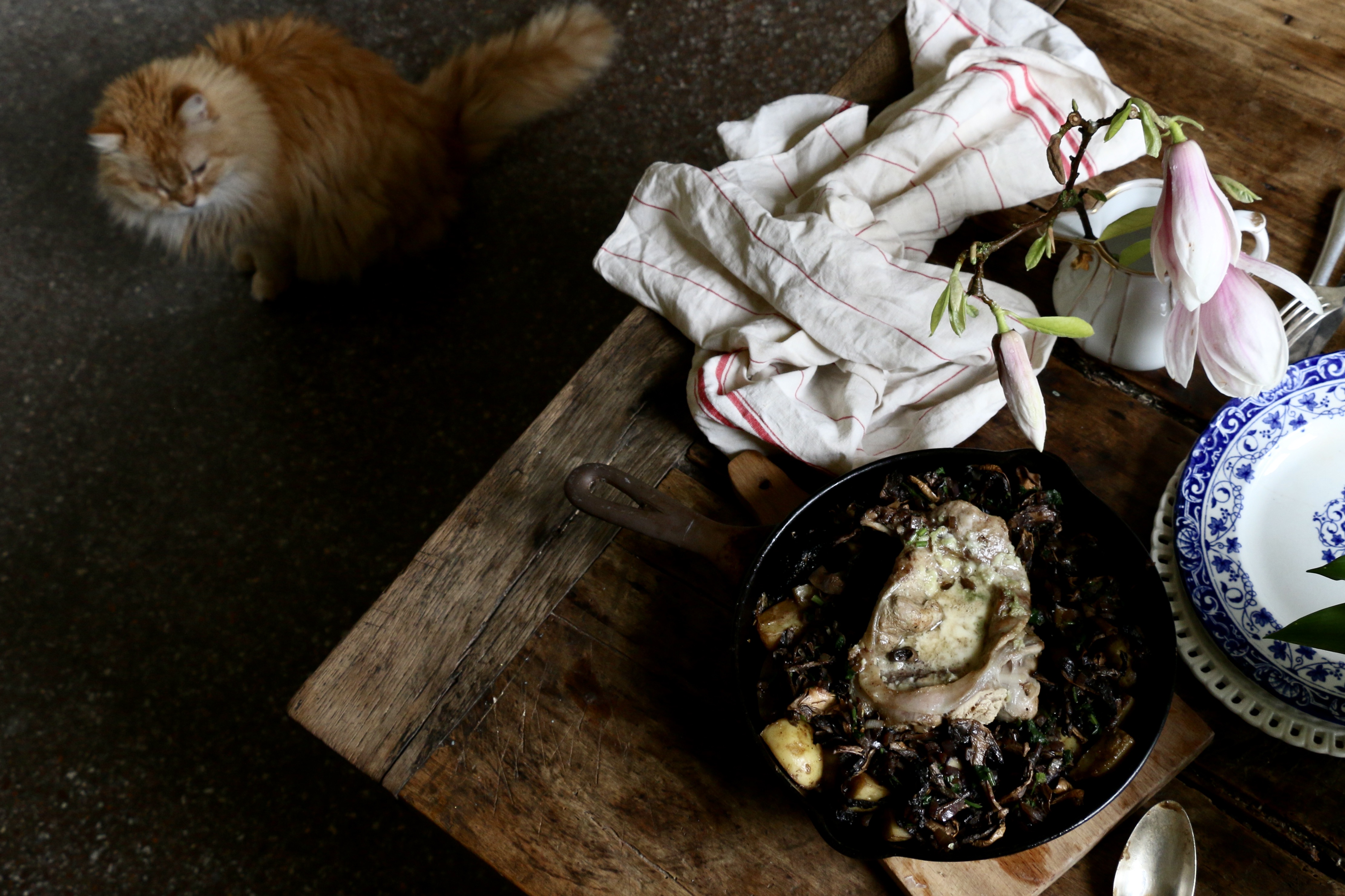 It was a particularly overcast day when I cooked that jarret de veau. A jarret de veau, that’s a veal shank. To cook it right, it takes a lot of time and love and a little finesse. I was inspired by Mimi Thorisson’s recipe for poulet cooked in crème fraîche and garlic galore, as it’s anyway an excellent idea to slather crème fraîche over almost any kind of dish, especially on an overcast day, and I figured the fatty cream would be perfect to keep the veal juicy and tender. I also had some foraged mushroom from the last autumn in the pantry that I wanted to add. And love.