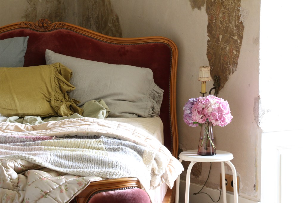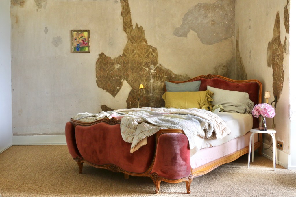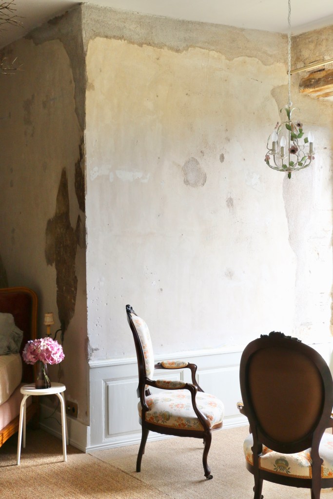 Sun and moon were in ok shape, perhaps a little bold in colour but ok and clean and neat would do for accommodating guests we found. We had beds made by the tapissier, the old French way, all hand made and natural materials, sheep wool and horse hair. It gives you the best of sleep. We furnished the two rooms with beautiful worn old furniture, each piece telling the story of a family and a life. The star though gave us a headache: the window only with benevolence could be called a window. Rain seeping in in one corner, hideous gypsum and glass wool wall coverings plus a couple of charming barn owls with a ludicrous sense of cleanliness nesting in a crevice to the bathroom*.