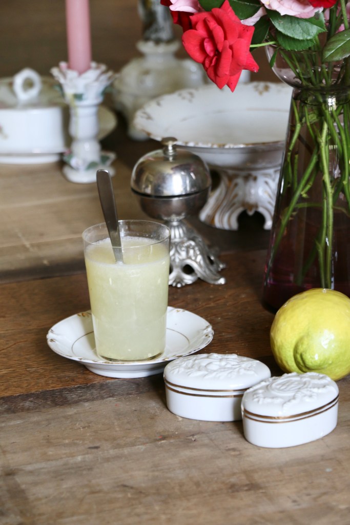 It is oh so warm, finally, I could very well spend all day on the chaise longue with book in hand, legs in the sun, except I can’t, chateau obliges, as I’m the head architectdecoratorplannerremoverofrubbishprimeexpertonscrubbingandscraping. But them as works hard merit delightful breaks, which I indulge in often and severally. Now in summer, in France, and you’re having a little break from whatever you are doing, including from vacationing, there’s one and only one perfect drink, which is: La Citronnade. It’s really just water and lemon and sugar but oh so refreshing, reviving, rejuvenating!