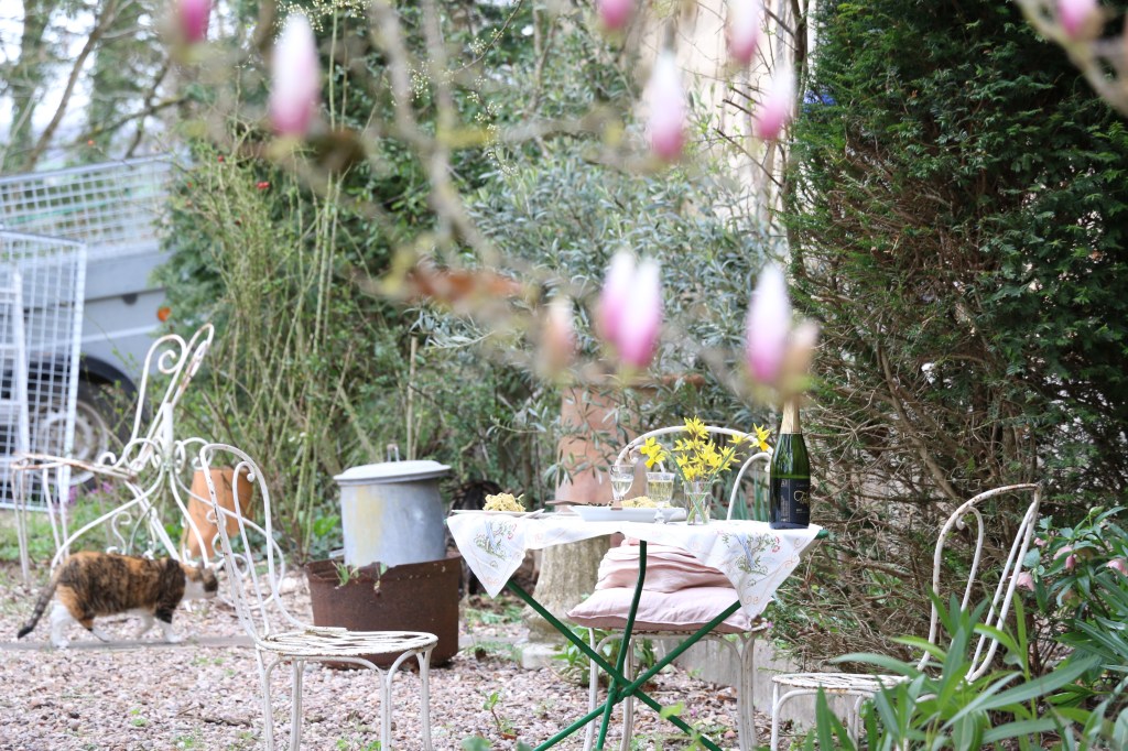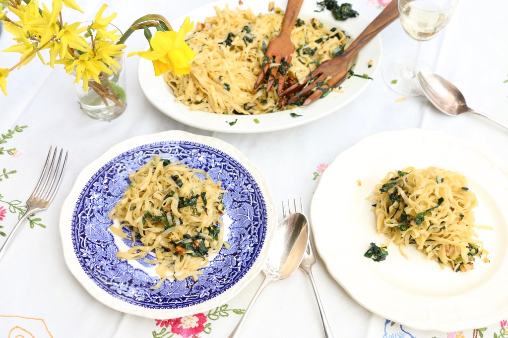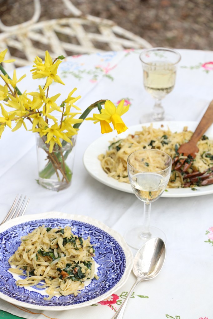 The day was promising, and as I opened the back door to the north terrace in my kitchen there was an almost balmy air greeting me. Time to move the hibernating plants outside! By the time I had dragged them out into the shade of the magnolia tree to get accustomed with outdoor life again, I was ravenous. I made us a quick and easy wild garlic pesto with homemade linguine and because it’s been the very first alfresco lunch of this year, we made it into a little celebration with a glass of bubbly from Orane Henriot. Absolute Bliss!