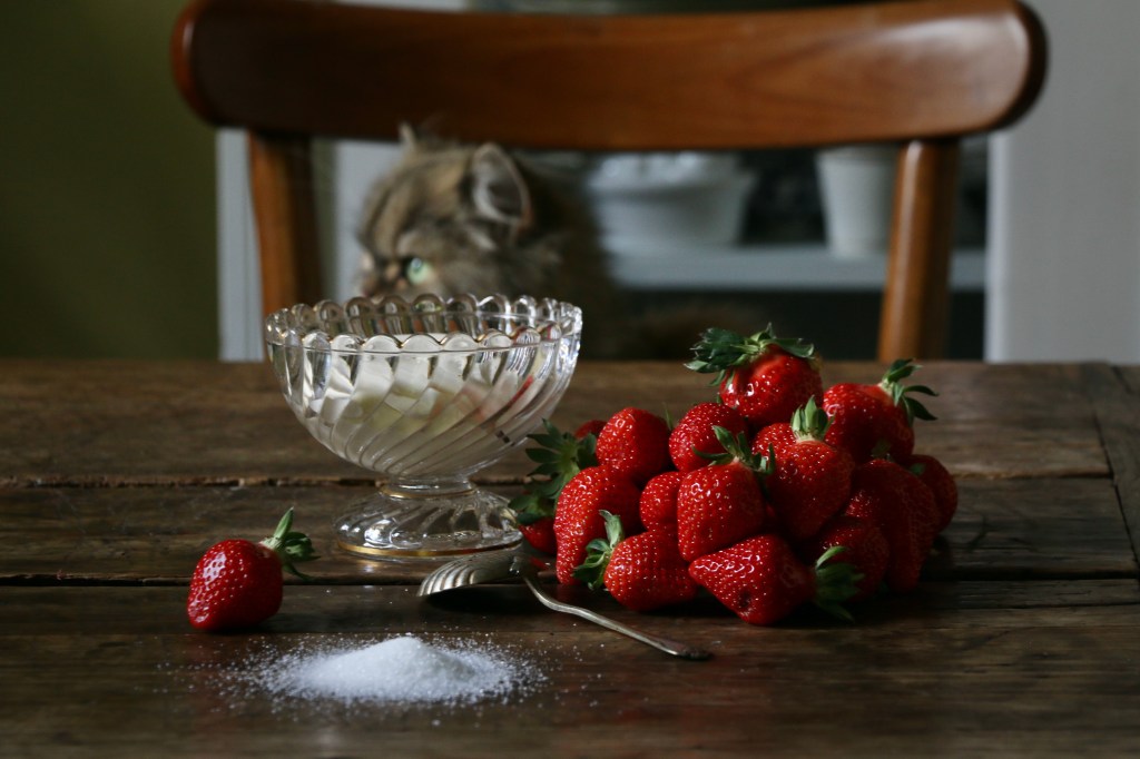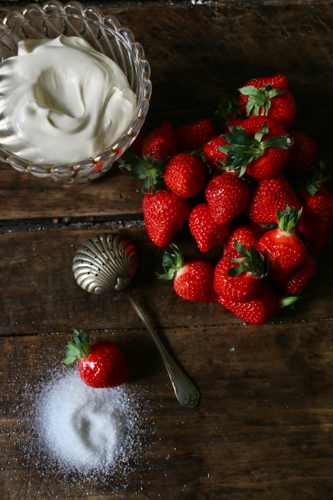 Place a teaspoon of sugar right on the table or into your plate, dip the strawberry in the cream and then gently turn it in the sugar. Et voilà you’ve made it to heaven.