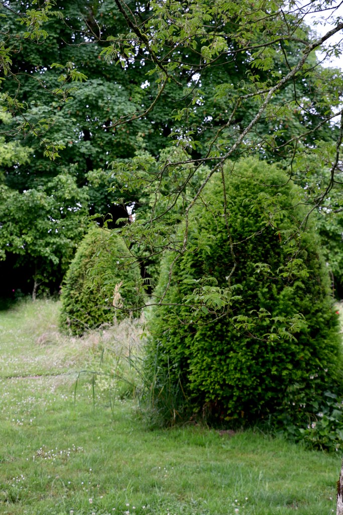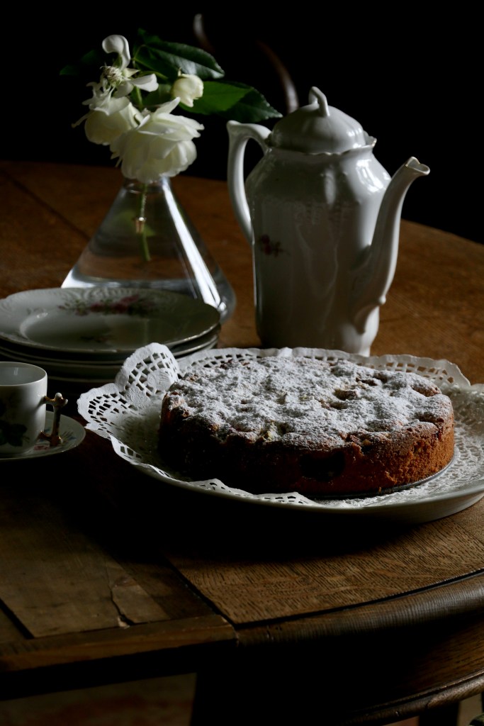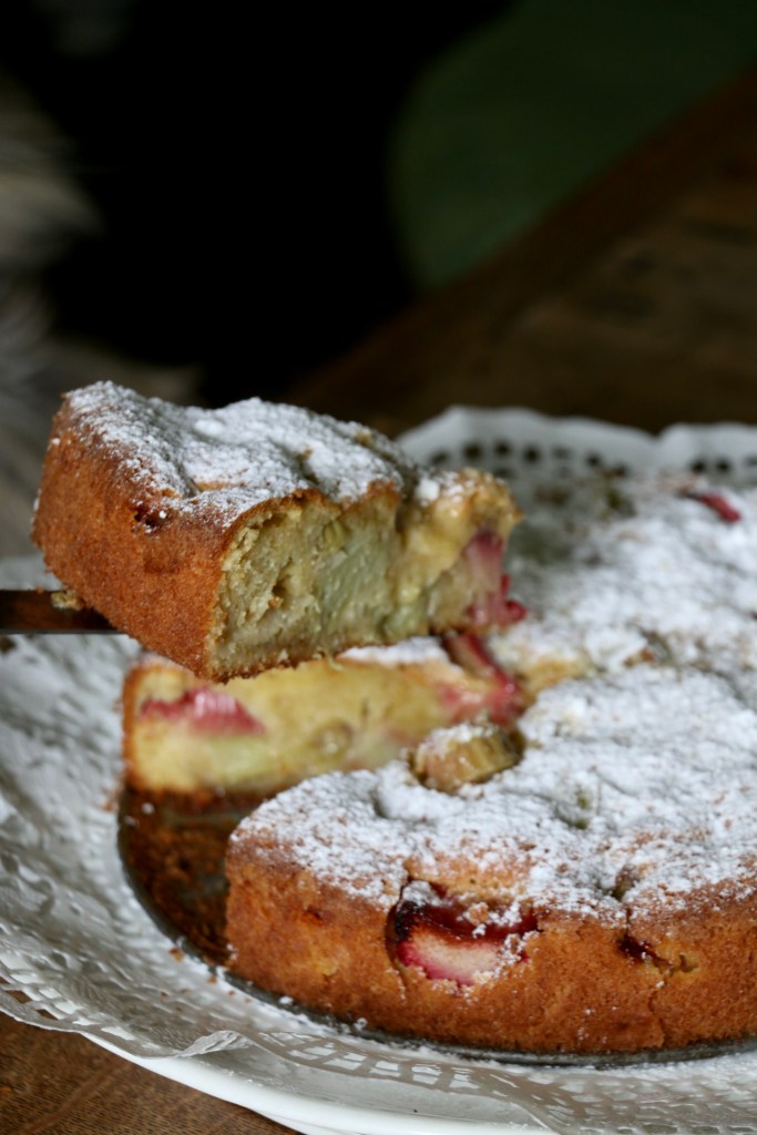 I know I know rhubarb season is over in June but then I just do have to give you the recipe to this cake I made the other day. I’m still without any proper potager, so I went back to the garden of my old house to get the rhubarb, splendid. Anyhow there’s a silver lining on the horizon re potager though I can’t talk about it yet. My lips are sealed. Will soon can, promised. And then I’ll plant an offspring of the possibly centenary rhubarb that’s growing in the garden at my old house, it has the habit of competing with giants.