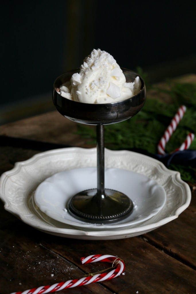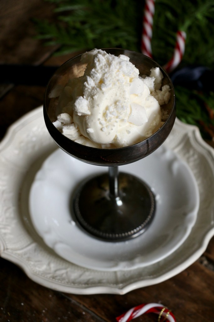 Whip the cream with the sugar until stiff, add a dash of cherry brandy. Gently fold in half the meringues. Transfer to a container and freeze over night. Take out of the freezer at least 40 minutes prior to serving, as the cream should be iced but not be ice. Serve in nice bowls, I love to use my silver sorbet bowls for this type of dessert. Sprinkle with meringues.
