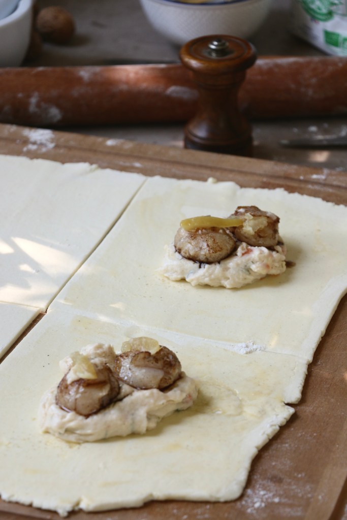 Sear the scallops in a little butter for no longer than 30 seconds on each side. Place a dollop of filling in the middle of each of the two puff pastry squares, place two scallops each on top and add a little more filling. Cover with the remaining squares. Then to the artsy bit – with the help of a sharp knive, cut into a scallop shell shapes. Firmly press the rims so nothing spills out during baking. Brush the tops with egg and lightly score shell like ridges.
